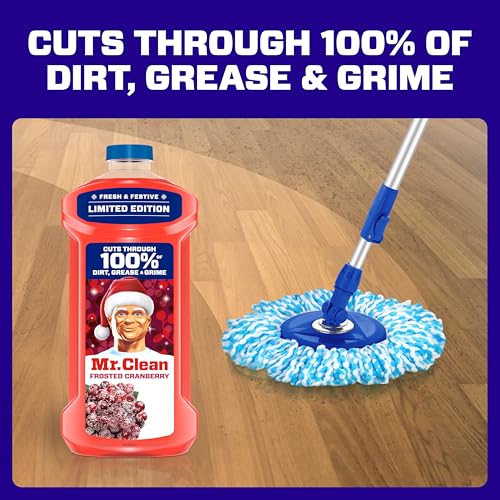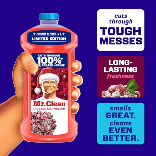 Mr. Clean’s 2X Concentrated* All Purpose Cleaner muscles through 100% of dirt and grease for powerful, multi surface cleaning. This floor cleaner for mopping is great for cleaning linoleum, tile & hardwood floors**. Use Mr. Clean all purpose cleaner as a bathroom cleaner to clean toilets, sinks, and bathtubs. It makes cleaning your house that much easier and leaves the long lasting freshness of Frosted Cranberry scent behind. Add Mr. Clean to your arsenal of cleaning supplies today! *vs. Mr. Clean Original **use diluted only