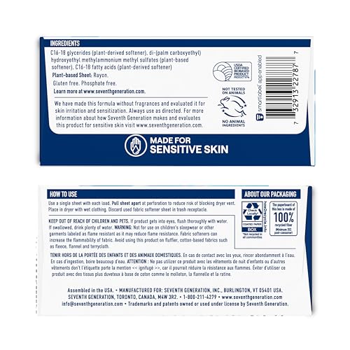 Seventh Generation Dryer Sheets Laundry Fabric Softener, Free & Clear Made for Sensitive Skin, 80 Sheets