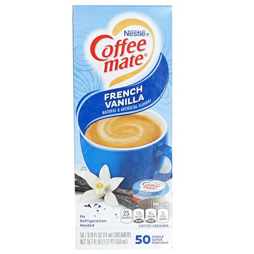 18.7 FL OZ BOX PACK OF 50: French Vanilla Coffee Creamer Singles: 50 Count box of French Vanilla Liquid Creamer Singles. Each coffee creamer has 0.38 Fl Oz. of liquid coffee creamer.