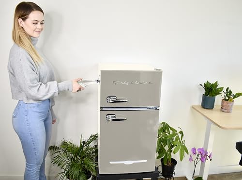 SLEEK FINISH: Featuring a sleek and durable platinum design with chrome trim, this small fridge freezer adds an upscale retro look that will elevate your space. Its compact size makes it perfect for your office, bedroom, dorm room, garage, or cabin.