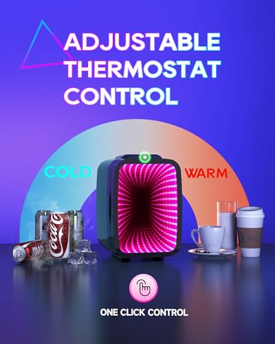 SWITCH COLORS WITH ONE CLICK: Small mini fridge Equipped with a touch screen LED light mirror door,Where the raised part is near the door is apparently where there’s a sensor that can be tapped to change it.Seventh press automatically switches colors,Long press to turn off.