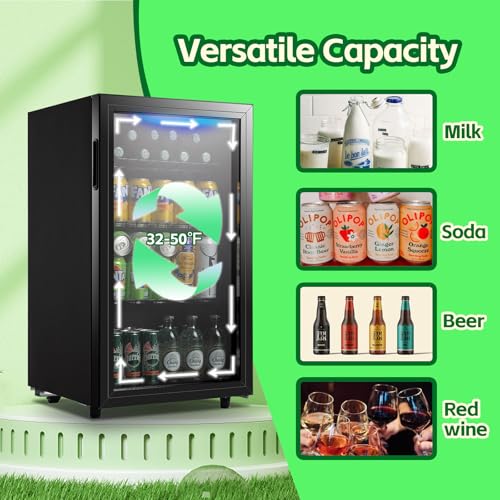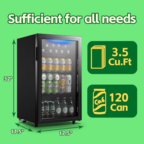 WANAI Beverage Refrigerator Cooler 3.5 Cu.Ft, 120 Can Mini Small Fridge with Glass Door LED Light and Adjustable Shelves for Soda Beer or Wine, Perfect for Home Bar Office, Black