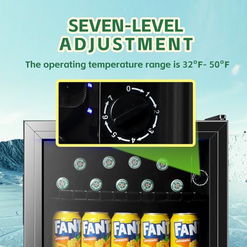Premium Features for Enhanced Convenience: WANAI refrigerator boasts a double pane glass door that not only blocks UV rays but also clearly displays its contents, providing exceptional insulation. 7-level Adjustment gives you the ability to fine-tune the cooling environment, guaranteeing that your beverages are kept at their ideal temperature ranging from 32°F to 50°F
