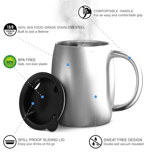 CHILLOUT LIFE Stainless Steel Insulated Coffee Mugs Set of 2 (14oz) – Double Wall Coffee Cups with Spill Resistant Lid & Strong Handle, Shatterproof Cups for Cold Drinks and Hot Beverages