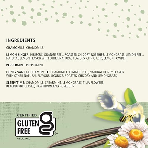 Herbal: Our herbal tea collection brings together five of our most comforting teas: Chamomile, Lemon Zinger, Peppermint, Honey Vanilla Chamomile, and Sleepytime.