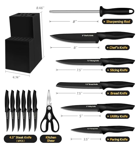 Knife Set with Block includes all of the most popular kitchen knives: 8“ Chef’s Knife, 7.5” Bread Knife, 7.5“ Slicing Knife, 5” Utility Knife, 3.5” Paring Knife, as well as a six-piece set of Steak Knives, Kitchen Scissors, Knife Sharpening Steel, 14 Slotted Hardwood storage block (with non-slip feet).