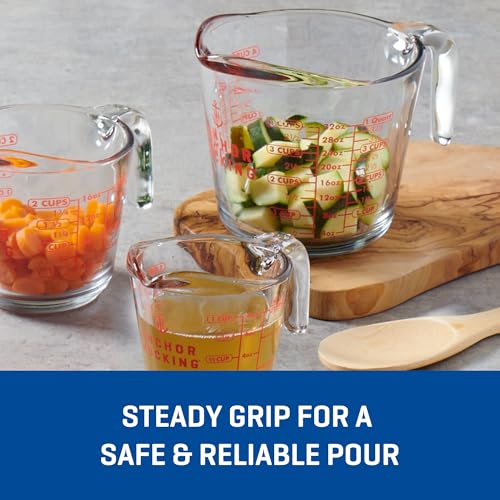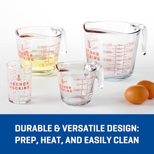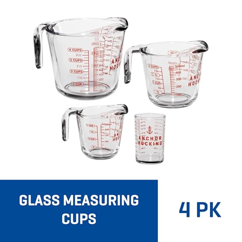 INCLUDES: This set contains (1) 5-oz glass measuring glass, (1) 1-cup glass measuring cup, (1) 2-cup glass measuring cup, and (1) 4-cup glass measuring cup. Anchor Hocking’s signature spout facilitates clean pouring to reduce messes and ensure precise measurements.
