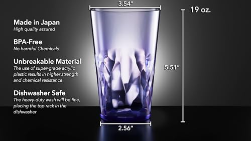 UNBREAKABLE ELEGANCE (MADE IN JAPAN) – Experience the luxury of real glass without the risk of breakage. These premium drinking glasses are made from top-quality, unbreakable material, perfect for every occasion. 3.54 in (Top) x 2.56 in (Bottom) x 5.51 in (Height), 100% Made in Japan, Super Grade Acrylic Plastic (BPA Free / Prop 65 compliant).