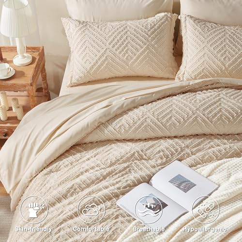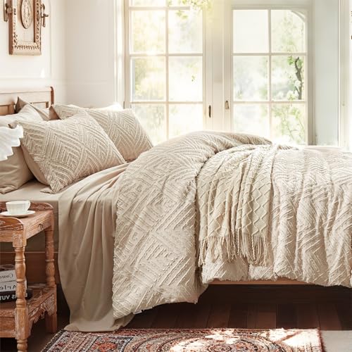 Zzlpp Queen Comforter Set 7 Pieces, Beige Bed in a Bag Queen Size, Tufted Boho Bedding Set with 1 Comforter, 2 Pillow Shams, 2 Pillowcases, 1 Flat Sheet, 1 Fitted Sheet