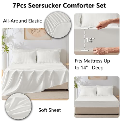 CozyLux Queen Comforter Set White Seersucker 7 Pieces Bed in a Bag Queen Comforter Set with Sheets, Luxury Soft Bedding Set with Down Alternative Comforter, Sheets, Pillowcases & Shams for All Seasons