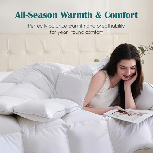 【All Season Warmth & Comfort】 Features the ideal amount of filling to perfectly balance warmth and weight, our goose down comforter offers exceptional insulation without feeling heavy. Designed to work year-round, lightweight yet cozy, it adapts to every season: warm enough for winter chills, light enough for summer nights.
