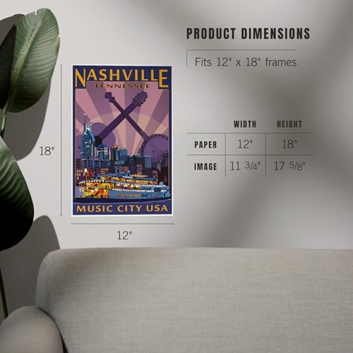 12 x 18 inch paper, 11 3/4 x 17 5/8 inch image area with white border; Lantern Press 12×18 Inch Art Print Wall Decor, Nashville, Tennessee, Skyline at Night,