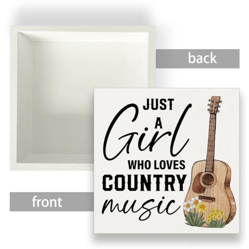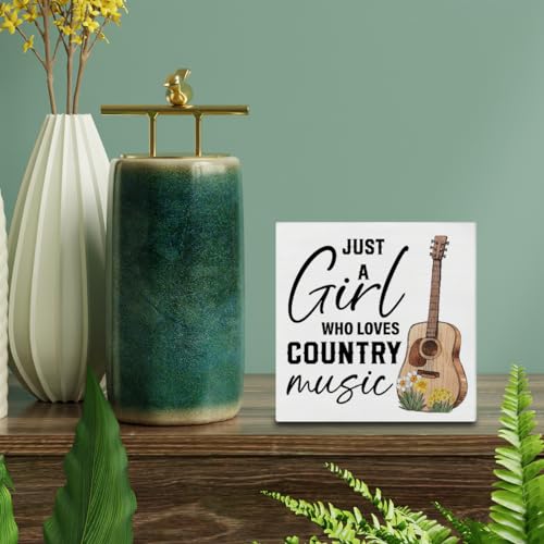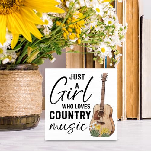 Western Just a Girl Who Loves Country Music Wood Sign Farmhouse Western Decorations for Desk Table Shelf Wall, 5 x 5 Inches