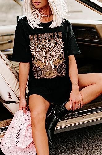 Nashville Music City T-Shirt Women Country Music Oversized Shirts Rock Band Tshirt Vintage Guitar Wings Graphic Tees