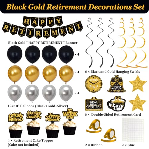 Retirement Party Decorations Men Women, Black Gold Happy Retirement Decorations, Happy RetIrement Banner, Retired Backdrop, Balloons, Pompoms, Hanging Swirls, Retired Cards, Cake Toppers Set 54pcs