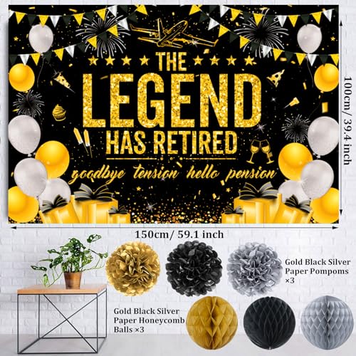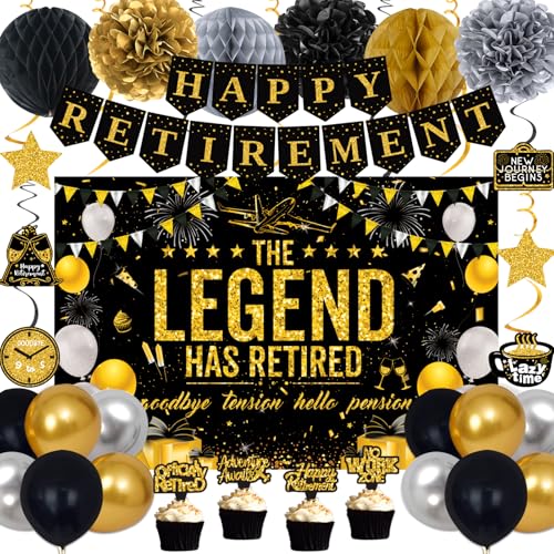 WHAT YOU GET: 1 × Black Gold “HAPPY RETIREMENT” Banner, 1 × “THE LEGEND HAS RETIRED” Backdrop Banner (39.4 × 59.1 inch), 12 × 10’’ Balloons (4 Black+4 Gold+4 Silver), 6 × Hanging Swirls (3 Black+3 Gold), 6 × Double-Sided Retirement Cards, 4 × Retirement Cake Topper, 3 × 8’’ Paper PomPoms (1 Black+1 Gold+1 Silver), 3 × 8’’ Paper Honeycomb Balls (1 Black+1 Gold+1 Silver), 2 × Glue, 2 × Ribbon, 1 × Threading Pin