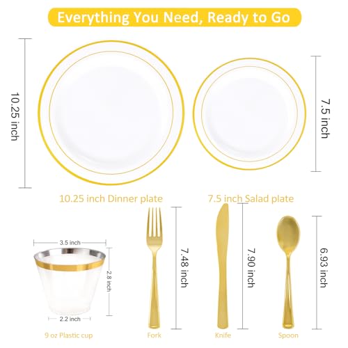 WELLIFE 350-Piece Gold Disposable Plates and Cutlery Set – Premium 10.25″ Dinner Plates, 7.5″ Dessert Plates, 9oz Cups & Cutlery for Weddings, Catering Events – 50 Guest Service – Elegant & Sturdy