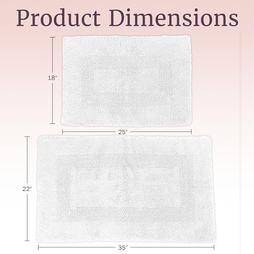 PRODUCT DETAILS – Materials: 100% Cotton and 2575 GSM. Dimensions: Large Mat: (L) 35” x (W) 22” x (H) 0.5”; Standard Mat: (L) 25” x (W) 18” x (H) 0.25”. 2-Piece-Set. Made in India. Color: White.