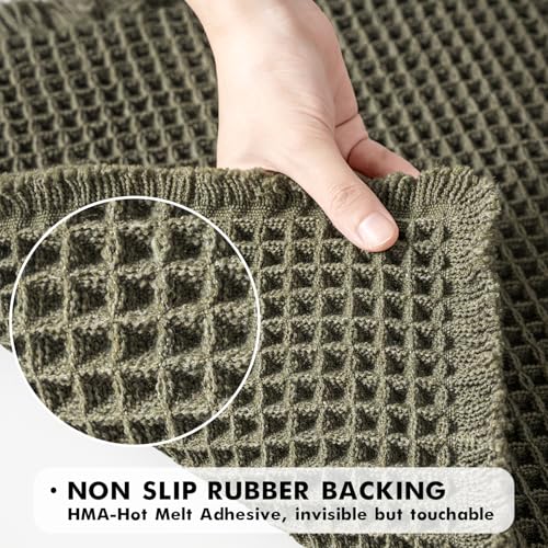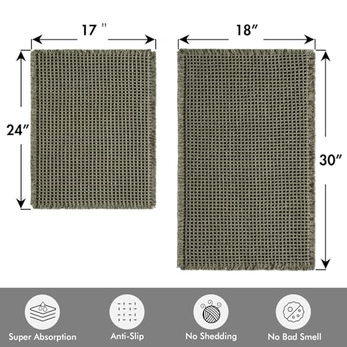 UPGRADED WAFFLE DESGIN: 17 x 24 & 18 x 30 Inch. Including 2 green waffle bath mats. These boho bath mats are woven with upgraded yarns. The heavier and thicker threads are applied to ensure the pattern will be more solid and compact. It is not only decorative but also durable and NEVER OUT OF SHAPE. Note: Length and width of these bath rugs include tassel part.