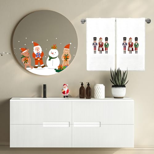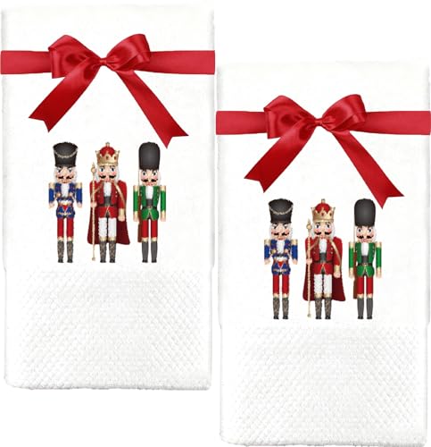 Classic Nutcracker Hand Towels: A set of 2 military-inspired hand textiles, each measuring 28.74 by 13.78 inches, featuring traditional soldier embroidery on a pure white foundation. These seasonal cotton hand linens combine holiday charm with practical household utility, serving simultaneously as functional fabrics and decorative nutcracker Christmas restroom adornments.