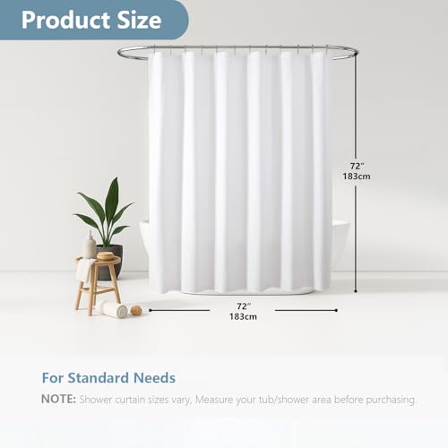 Easy installation: Each white fabric shower curtain has 12 button holes which fit most curtain hooks. The 72×72 Inches white shower curtain fits most standard-sized bathtubs and showers, adds elegance to your bathroom, offering you luxurious hotel bath at home.